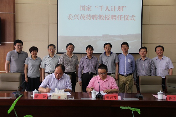 6月9日下午,在南区行政楼912视频会议室,学校举行兼职教授聘任仪式,聘请常州大学教授姜兴茂为我校兼职教授。副校长邵荣主持聘任仪式,校长葛世伦向姜教授颁发了特聘教授聘书。校科技产业处处长王路明、人事处副处长朱雪梅、协同创新中心主任奚新国、校办公室副主任陈阳、江苏省新型环保重点实验室常务副主任侯贵华、副主任张勤芳等出席聘任仪式。