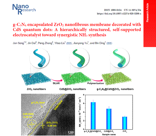 近日,江苏省新型环保重点实验室宋骏博士为第一作者的研究论文《g-C3N4 encapsulated ZrO2 nanofibrous membrane decorated with CdS quantum dots: A hierarchically structured, self-supported electrocatalyst toward synergistic NH3 synthesis》在SCI一区材料科学Top期刊、中国科技期刊卓越行动计划项目领军期刊《Nano Research》上发表(影响因子8.183)。