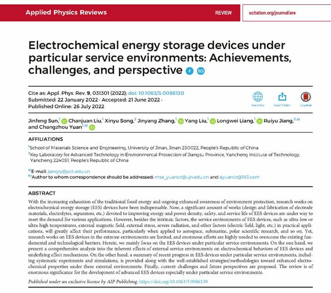 近日,省新型环保重点实验室、协同创新中心团队联合济南大学的研究论文《Electrochemical energy storage devices under particular service environments: Achievements, challenges, and perspective》在国际顶级期刊Applied Physics Reviews上发表(Appl. Phys. Rev. 9, 031301 (2022),最新影响因子19.527)。我校姜瑞雨教授为通讯作者之一。