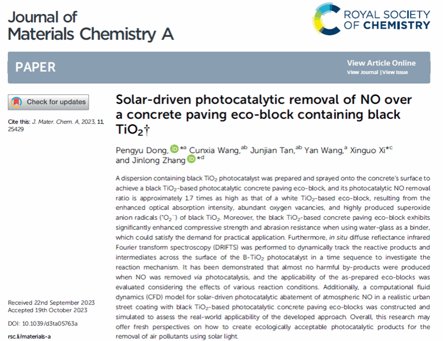 近日,我室董鹏玉博士为第一作者、以盐城工学院为第一单位的研究论文“Solar-driven photocatalytic removal of NO over a concrete paving eco-block containing black TiO2”在材料类顶级期刊《Journal of Materials Chemistry A》(2023, 11, 25429-25440)上发表。《Journal of Materials Chemistry A》是英国皇家化学会RSC旗下重要期刊,该期刊2022年影响因子为14.511,主要刊登能源与可持续材料化学领域高水平的研究成果,属于材料学科Top期刊。