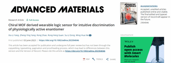 近日,我室解明华及杨秀丽教授课题组在国际材料学科顶尖期刊Advanced Materials上发表题为“Chiral MOF derived wearable logic sensor for intuitive discrimination of physiologically active enantiomer”的研究成果(DOI:http://dx.doi.org/10.1002/adma.202304046)。这是我校教师首次以第一作者,盐城工学院为唯一通讯单位在Advanced Materials期刊发表研究论文。Advanced Materials是德国Wiley出版集团旗下在工程材料与化学大领域的顶级期刊,在国际材料领域科研界上享誉盛名。该期刊收录材料研究领域最前沿的高端论文,是材料科学领域最具影响力的期刊,目前最新影响因子为32.086。