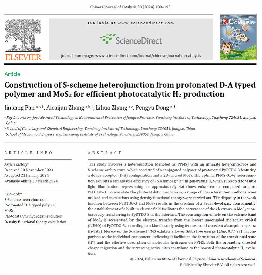 近日,以我校研究生潘劲康为第一作者、董鹏玉教授为唯一通讯作者、盐城工学院为唯一单位的研究论文“Construction of S-scheme heterojunction from protonated D-A typed polymer and MoS2 for efficient photocatalytic H2 production”在《Chinese Journal of Catalysis》(2024, 58, 180-193)上发表。该期刊2023年影响因子为16.5,主要刊登催化化学领域高水平的研究成果,属于化学学科Top期刊与中科院1区期刊。