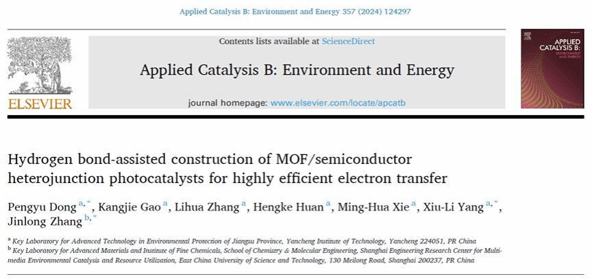 近日,我室董鹏玉教授为第一作者、以盐城工学院为第一单位的研究论文“Hydrogen bond-assisted construction of MOF/semiconductor heterojunction photocatalysts for highly efficient electron transfer”在化学类顶级期刊《Applied Catalysis B: Environment and Energy》 (357 (2024) 124297) 上发表。《Applied Catalysis B: Environment and Energy》是Elsevier旗下重要期刊,该期刊2023年影响因子为22.1,主要刊登催化化学领域高水平的研究成果,属于化学类Top期刊与中科院1区期刊。
