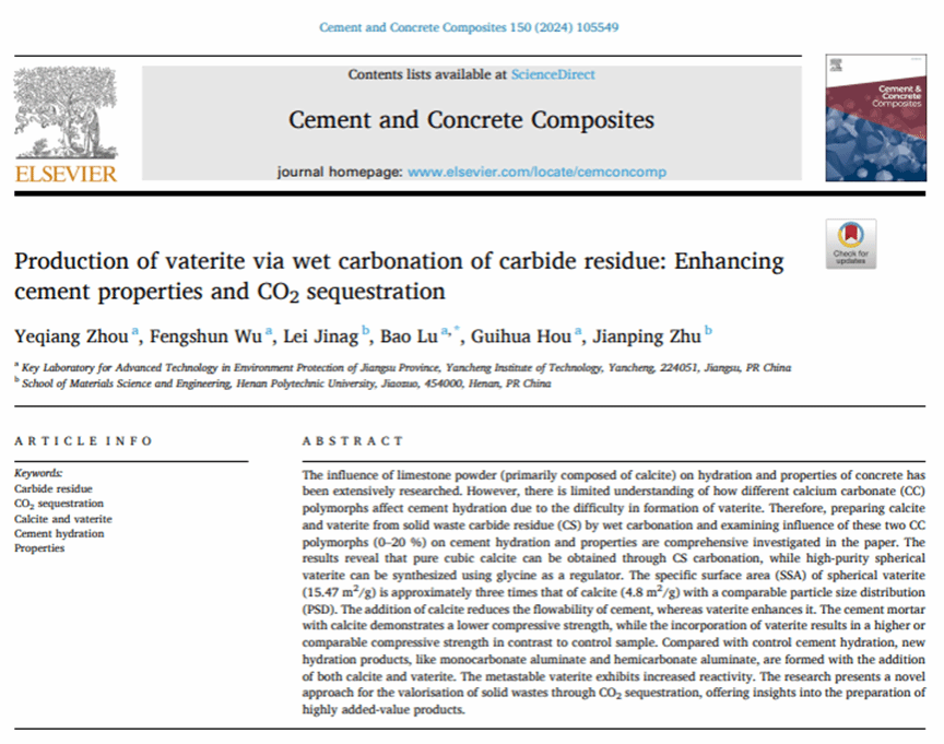 近日,以我校研究生周业强为第一作者、我室卢豹博士为唯一通讯作者、盐城工学院为第一单位的研究论文“Production of vaterite via wet carbonation of carbide residue: Enhancing cement properties and CO2 sequestration” 在水泥混凝土领域Top期刊《Cement and Concrete Composites》(2024,150,105549)上发表。该期刊2024年影响因子为10.5,属于中科院1区期刊。